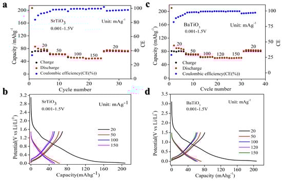 To understand rate capability, Figure 6a,b show the rate performance of STO and BTO at a current density ranging from 20 mA g−1 to 150 mA g−1. The data unequivocally demonstrate that both materials exhibit superior rate performance.