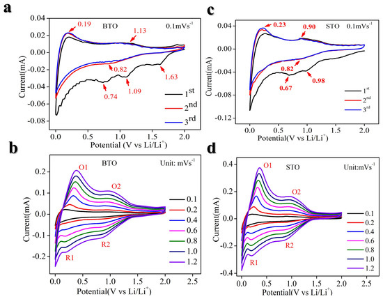 Cyclic voltammetry (CV) curves of the BTO and STO at room temperature. (a) CV of BTO in the first 3 cycles at a scan rate of 0.1 mV s−1. (b) CV of BTO in the different scan rates of 0.1–1.2 mV s−1. (c) CV of STO in the first 3 cycles at a scan rate of 0.1 mV s−1. (d) CV of STO in the different scan rates of 0.1–1.2 mV s−1.
