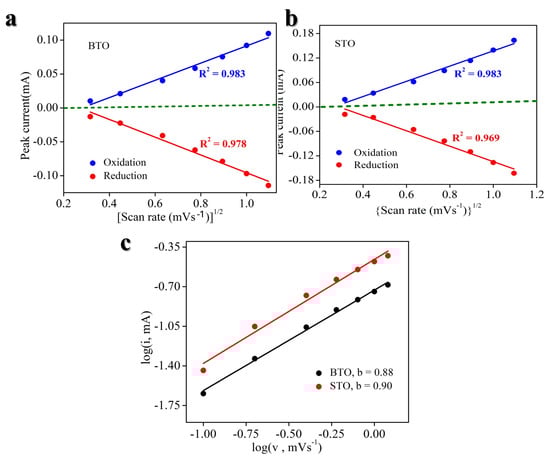 (a) Peak current (i) vs. v1/2 (square root of scan rate (v)) of BTO. (b) Log (i) (peak current (i)) vs. log (v) (scan rate (v)) of STO. (c) Log (i) vs. log (v) of BTO and STO.