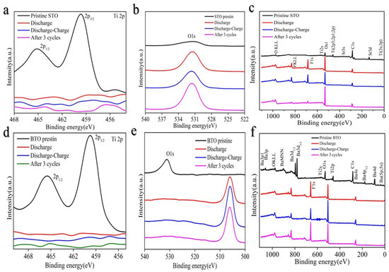 X-ray photoelectron spectroscopy (XPS) measurement. (a) Pristine STO, lithiation (discharge), lithiation–delithiation (discharge–charge), after 3 cycles. (b) O1s. (c) STO survey different conditions. (d) Pristine BTO, lithiation (discharge), lithiation–delithiation (discharge–charge), after 3 cycles. (e) O1s. (f) BTO survey different conditions.