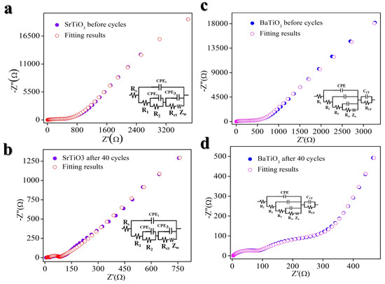 Figure 10a–d present the electrochemical impedance spectroscopy (EIS) [57] data for STO- (Figure 10a,b) and BTO (Figure 10c,d)-based electrodes under various conditions, specifically prior to charging and following 40 cycles. The EIS spectra can be divided into three primary electrical components: internal resistance (RΩ), electric double-layer capacitance (Cd), and faradaic impedance (Zf). Faradaic impedance (Zf) is further subdivided into charge transfer and mass transfer components, corresponding to high- and low-frequency regions, respectively [57,58]. The charge transfer component can be represented by charge transfer resistance (Rct) and Warburg impedance (Zw). The initial cell before charging displays low charge transfer resistance (Rct). After 40 cycles, the Rct progressively decreases, indicating the excellent stability and performance of the BTO- and STO-based electrodes.