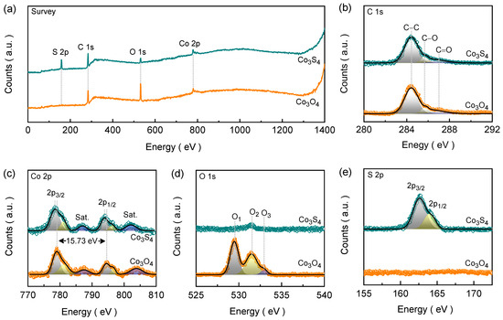 (a) High-resolution XPS survey spectra and the narrow-ranged XPS emission spectra for (b) C 1s (c) Co 2p, (d) O 1s, and (e) S 2p of the Co3O4 and Co3S4 electrode films. The high-resolution emission spectra were deconvoluted using the Gaussian curve fitting model.