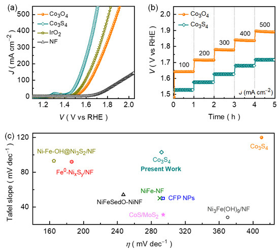 Moreover, the overpotentials required to drive the current densities of 200, 300, 400, and 500 mA cm−2 for the polyhedron-like Co3S4 catalyst were 352, 395, 431, and 463 mV, respectively. However, to drive the same anodic current densities, the required overpotentials for the Co3O4 catalyst were 483, 546, 604, and 657 mV (vs. RHE). The smaller overpotentials of the Co3S4 catalyst at all anodic current densities demonstrated its superior catalytic OER activity compared to that of the pure Co3O4 catalyst. The noticeable improvement in the catalytic activity of the Co3S4 catalyst suggests that the substitution of sulfur with oxygen constituent enhances the material conductivity (Figure S2) and elevates the accessible active sites (Figure S3), thereby improving electron transfer throughout the polyhedron network [48,49,50]. This increased electron mobility leads to faster reaction kinetics, as the sulfur atoms modify the electronic properties, lowering energy barriers, and facilitating more efficient catalytic reactions [51,52,53].