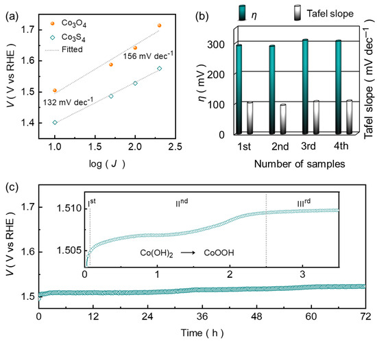 (a) Tafel slope for the Co3O4 catalyst films. (b) Reliability of the Co3S4 for the catalytic OER. (c) Prolonged chronopotentiometric OER stability of Co3S4 catalyst measured up to 72 h at a current density of 100 mA cm−2.