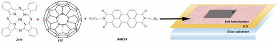 ITO–glass slides 15 × 20 mm in size were bought from Ossila and used as substrates in the MAPLE deposition. The chemical structure of ZnPc, C60, and AMC14 and a schematic representation of the structure fabricated with the organic thin films deposited by MAPLE are presented in Figure 1.
