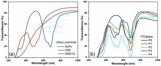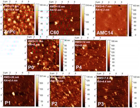 Comparing the binary layers (P0 and P4), it was noted that the films with C60 as acceptor were thinner (105 nm) and less rough (11 nm) than the film based on AMC14 (145 nm thickness and 14 nm roughness). This result suggests that inside P0 film, the C60 molecules with a diameter of ~0.7 nm was well incorporated among the ZnPc molecules with a diameter of 1.5 nm [47,48]. Moreover, the addition of C60 in the film with a higher content of AMC14 (P3) decreased both the thickness (130 nm) and roughness (7.6 nm) of the layer. The P1 sample containing the higher amount of ZnPc was the roughest (20.3 nm) and the thickest (165 nm) film from the binary or ternary mixed layers. A decrease in the roughness was achieved by lowering the ZnPc content in the P2 and P3 samples. Consequently, the thickness and roughness values of the MAPLE-deposited films were adequately for their integration in structures with applicability in the field of optoelectronic devices.