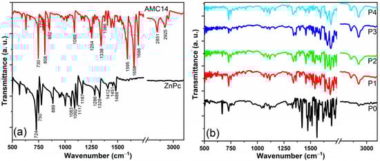 FTIR spectra of the MAPLE-deposited organic layers: (a) ZnPc and AMC14 thin films and (b) mixed thin films.