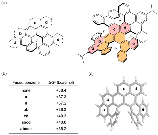 (a) Structures of π-expanded [6]helicenes appearing in A (orange, [6]helicene; pink, extended benzene rings). (b) List of racemization barriers. (c) Optimized structure of transition state for abcde-fused [6]helicene. Calculations were performed at the B3LYP-D3/6-31G(d) level of theory.