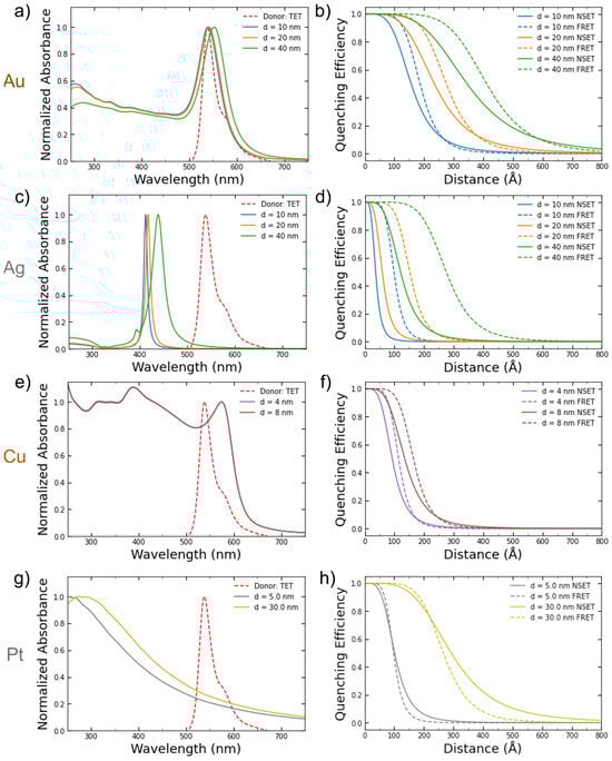 Calculated absorbance spectrums for (a) gold, (c) silver, (e) copper, and (g) platinum NPs of varying commercially available or easily synthesized sizes compared to the emission spectrum of the TET dye. The resulting calculated FRET and NSET fluorescence quenching efficiencies for those same-sized (b) gold, (d) silver, (f) copper, and (h) platinum NPs.