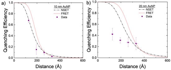 Calculated NSET and FRET values for AuNPs of size (a) d = 10 nm and (b) d = 20 nm, compared to experimentally found values. Each DNA length was measured four times with the mean and standard error displayed. The distance error bars are partially covered by the symbols.