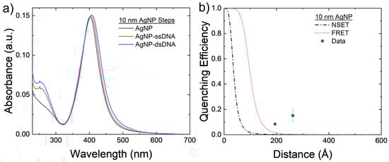 (a) Absorbance spectrum of the 10 nm AgNPs at varying steps of the conjugation process for the 60 bp DNA strands. Notice the small red shifting of the main plasmon peak, possibly coming from AgNP aggregation. (b) Comparison of experimental 10 nm AgNP–TET to FRET and NSET models. Averages and standard errors from 3 measurements are plotted.