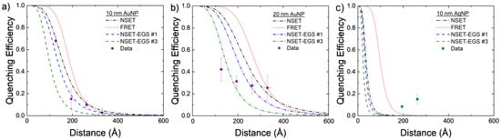 Experimental values compared to calculated FRET (red dots), initial NSET value (black dashes), and final fitted NSET values (dashes are the best optimization results from the exhaustive grid searches) for (a) 10 nm AuNPs, (b) 20 nm AuNPs, and (c) 10 nm AgNPs.