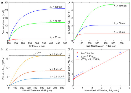 where . Figure 2b illustrates the dependence of the diffusion flux on the pitch for different values of the diffusion length on the substrate. The curves presented in Figure 2b confirm that the flux increases with the substrate diffusion length as well as with the impingement flux rate (Figure 2c). Clearly, in a situation with a close-packed geometry (P = 2R), there is no diffusion flux as there is no free substrate surface. When the distance between the NWs reaches a certain value P*, the flux saturates at . The P* value was estimated via finding a solution to the equation . Using Equation (6), the latter expression can be re-written in the following form: