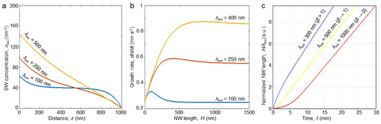 Modeling results: NW growth. (a) Distribution of adatom concentration on the sidewalls for different sidewall diffusion lengths (considering ). (b) Dependence of the growth rate on NW length H with the following parameters: . (c) Time dependence of the normalized NW length (H/) for the different sidewall diffusion lengths and corresponding values.