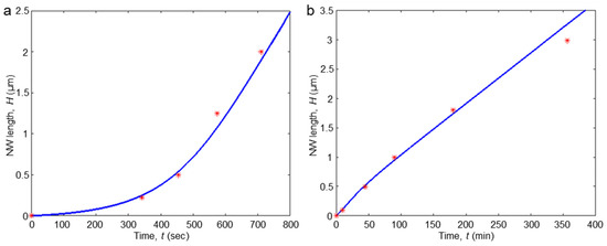 which corresponds to the elongation Equation (1). This allows us to define the change in the NW elongation rate depending on its length (Figure 3b) and, consequently, temporal dependence of NW’s length (Figure 3c). As can be seen, NW elongation can be sufficiently nonlinear during the initial growth stage due to the influence of the diffusion flux from the substrate which affects decays with time. At the beginning of the growth the elongation rate can be estimated as: