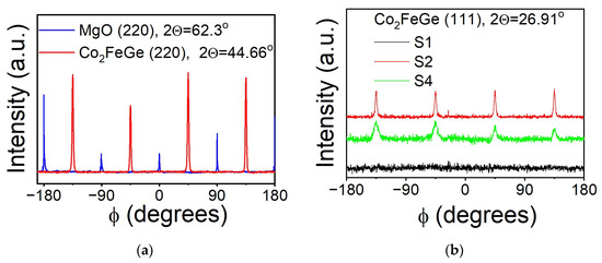 In-plane film orientation was checked using in-plane ϕ-scans for asymmetric (022) reflections from Co2FeGe and MgO. A typical ϕ-scan is presented in Figure 3a for Sample S4. Fourfold symmetry with 90° intervals is clearly seen in the reflections from the Co2FeGe film. Those from the MgO substrate are shifted by 45° with respect to the film, which proves the formation of an epitaxial layer with a well-defined in-plane epitaxial relationship [110] Co2FeGe || [100] MgO.