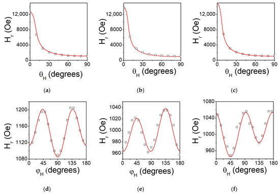 Out-of-plane (top panel) and in-plane (bottom panel) angular dependences of the resonance field Hr for samples deposited at TS = RT (S1) (a,d), deposited at TS = RT and annealed for 1 h at Ta = 573 K (S4) (b,e), and deposited at TS = RT and annealed for 1 h at Ta = 773 K (S5) (c,f). The lines drawn through the data are the lines of best fit using Equations (1) and (2) for out-of-plane and in-plane, respectively.