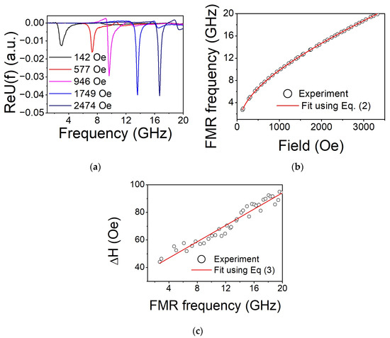 The real part of the U(f) function calculated from the measured complex S21 spectrum at different applied fields (a); dependence of the FMR frequency on applied magnetic field obtained using the methodology described in ref. [4]. Experimental points are accompanied by a line of best fit (solid red line) using Equation (2) (b); dependence of FMR linewidth ΔH as a function of resonance frequency for Co2FeGe S4 sample. Experimental points are accompanied by a line of best fit (solid red line) using Equation (3) (c).