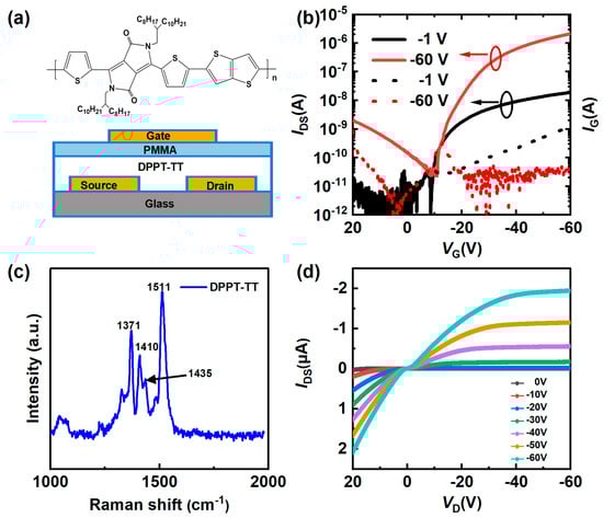 Figure 1c shows the Raman spectrum of DPPT-TT, consistent with the previous report []. There are four main peaks located at 1371 cm−1, 1410 cm−1, 1435 cm−1, and 1511 cm−1. Each peak corresponds to C=C stretching, thienothiophene core, C=C stretching thienothiophene core and C-C stretching thiophene ring, C=C/C-C stretching/shrinking on thiophene, C=C stretching in DPP unit. Figure 1d displays the output characteristics (ID − VG) of the phototransistors, detailing their functionality across a VG spanning of 0 to –60 V with step of –10 V. There is a noticeable and distinct transition from the linear regime to the saturation regime, which evidences P-type transistor characteristics.