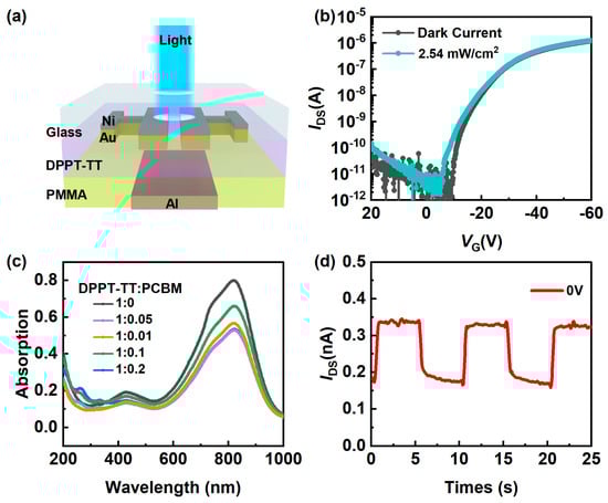 The device architecture of the top-gate, bottom-contact organic phototransistor, and the molecular structure of DPPT-TT are depicted in Figure 1a. Eagle glass was first subjected to a cleaning procedure consisting of sequential ultrasonic immersions in alcohol, deionized water, and alcohol for 15 min each. Then, a 10 nm nickel (Ni) adhesion layer and 20 nm gold (Au) source-drain electrodes were deposited on the glass substrate by thermal evaporation using a shadow mask. The channel width (W) was 1200 μm, while the channel length (L) ranged from 150 μm to 500 μm. UV Ozone was used to clean the substrates to enhance their hydrophobic properties. Subsequently, within a nitrogen-filled glovebox, a 20 nm-thick layer of DPPT-TT:PCBM (weight ratio) was deposited onto the substrate by spin coating at 500 rpm for 5 s and then at 2000 rpm for 1 min. This was followed by pre-annealing at 80 °C for 5 min and then annealing at 150 °C for 60 min. PMMA purchased from Sigma Aldrich was dissolved in n-butyl acetate at 80 mg/mL and was spin-coated to serve as the gate dielectric. Spin-coating was performed at a rotational speed of 500 rpm for 5 s and 2000 rpm for 1 min, and the specimens were annealed at 80 °C for 9 h. A 100-nm-thick aluminum gate electrode (Al) was subsequently deposited using thermal evaporation with a shadow mask. Electrical characterizations were conducted in ambient conditions using a probe station coupled to a Keysight B1500A semiconductor parameter analyzer (Keysight Technologies, Colorado Springs, CO, USA). The UV-visible spectra were acquired using the UV-3600 Plus instrument (Shimadzu Corporation, Kyoto, Japan). The Atomic Force Microscopy (AFM) measurements were conducted using the Cypher S AFM instrument (Oxford Instruments-Asylum Research, Santa Barbara, CA, USA). The Raman spectroscopy data were acquired using the MStarter 100 instrument (Metatest Corpotation, Nanjing, China).