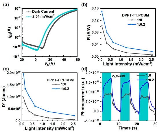 (a) Transfer curves of a device with DPPT-TT: PCBM ratio of 1:0.2. (b) Responsivity at different light intensities (VD = −60 V). (c) Specific detectivity with different light intensities (VD = −60 V). (d) Response time of the device with DPPT-TT:PCBM ratios of 1:0 and 1:0.2.