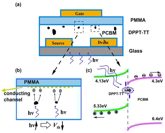 In order to investigate the underlying mechanism, Figure 5 provides a schematic representation of the device’s operating principles. Specifically, Figure 5a, Figure 5b, and Figure 5c illustrate the channel conduction and the energy band diagrams at the interface between the DPPT-TT and PCBM nanocrystals, respectively. When a sufficiently high negative gate voltage is applied, holes start to accumulate within the channel. When UV light is turned on, excitons are generated at the interface of DPPT-TT and PCBM nanocrystals. After the electron–hole pairs are effectively separated by the space charge region at the heterojunction interface, some holes continue to enter the conducting channel, as shown in Figure 5b. The existence of excitons at the interface between DPPT-TT and PCBM is depicted in Figure 5c, which suggests that the PCBM nanocrystals embedded in the semiconductor layer create an intermediate state within the band gap. When the semiconductor layer of a phototransistor is exposed to UV radiation, it absorbs UV light. Upon excitation, excitons are indeed formed at the interface. Excitons are free to move, but their mobility is constrained by their lifetime, which limits the distance they can travel. This process is related to the binding energy. An energy level mismatch exists at the interface between the semiconductor layer DPPT-TT and PCBM. It causes the electrons to transfer to the lowest unoccupied molecular orbital (LUMO) with an energy level of 4.3 eV. In the meantime, the holes migrate to the highest occupied molecular orbital (HOMO) with an energy level of 5.33 eV. Under the action of the source-drain electric field, the directed movement of charges is formed, creating electron and hole flow. The mismatch of interface energy levels reduces the electron–hole recombination and concurrently increases the phototransistor’s photogenerated current. The energy level mismatch at the interface between D-A polymer and nanocrystalline particles improves the quantum efficiency, resulting in enhanced UV detection performance of the phototransistors. The presence of an optimal interface, crafted through molecular engineering, reduces the effective barrier for exciton dissociation, enhancing the transfer of electrons to the LUMO and holes to the HOMO.