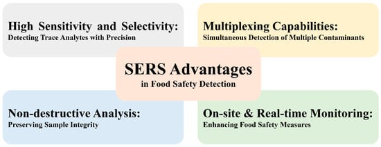 High sensitivity and selectivity are key advantages of SERS for the precise detection of trace analytes. SERS can identify and quantify extremely low concentrations of analytes even at the single-molecule level, as presented in Table 1. This high sensitivity is attributed to signal enhancement mechanisms inherent to SERS, such as electromagnetic enhancement, chemical enhancement, and hotspot effects. Figure 2 shows the overall advantages of SERS for food safety detection.