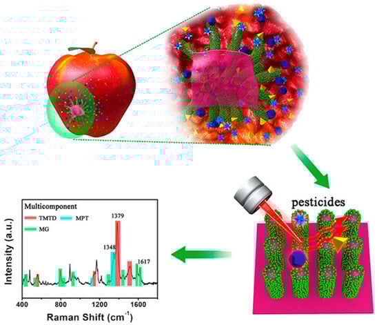 - Xie, T.; Cao, Z.; Li, Y.; Li, Z.; Zhang, F.L.; Gu, Y.; Han, C.; Yang, G.; Qu, L. Highly sensitive SERS substrates with multi-hot spots for on-site detection of pesticide residues. Food Chem. 2022, 381, 132208. [Google Scholar] [CrossRef]