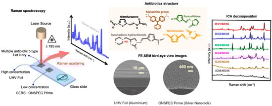 - Limwichean, S.; Leung, W.; Sataporncha, P.; Houngkamhang, N.; Nimittrakoolchai, O.U.; Saekow, B.; Pogfay, T.; Somboonsaksri, P.; Chia, J.Y.; Botta, R.; et al. Label free detection of multiple trace antibiotics with SERS substrates and independent components analysis. Spectrochim. Acta Part A Mol. Biomol. Spectrosc. 2023, 295, 122584. [Google Scholar] [CrossRef]