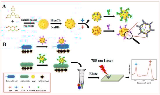 - Yang, Y.; Li, G.; Wang, P.; Fan, L.; Shi, Y. Highly sensitive multiplex detection of foodborne pathogens using a SERS immunosensor combined with novel covalent organic frameworks based biologic interference-free Raman tags. Talanta 2022, 243, 123369. [Google Scholar] [CrossRef]