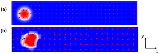 In this equation, represents the device temperature, stands for the Boltzmann constant, denotes the permeability and indicates the computational cell volume. The simulations were performed using the Object Oriented Micromagnetic Framework (OOMMF) [45]. The initial state is shown as the blue region, where the magnetic moments are oriented towards the negative z-direction (mz = −1), while within the skyrmion (red region), the magnetization points upwards (mz = +1), as illustrated in Figure 1a, at device temperature of 0 K. Figure 1b illustrates the magnetization fluctuations of both the device and the skyrmion at a device temperature of 100 K. The study considers magnetic nanowires with dimensions of length (L), width (w) and thickness (th), specified as (200. The radius of the skyrmion (r) is 50 nm.