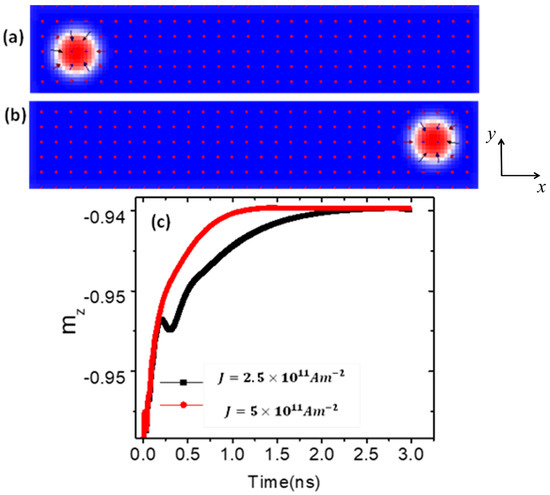 Thus, the main objective of this study is to enhance skyrmion thermal stability and nucleation in magnetic nanodevices based on device temperature. The structural stability of skyrmions is first investigated by driving them to the end of a nanowire at different current densities under a simulated temperature of 0 K. It was observed that at 0 K, no change in the skyrmion diameter occurred as it moved to the end of the nanowire, as shown in Figure 2a,b.