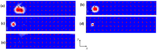To further confirm the skyrmions’ structural stability during their dynamics in the magnetic nanowire, a normalized magnetization component in the z-direction (mz) was plotted as a function of time for two current density values, as shown in Figure 2c. However, as shown in Figure 3a, once the device temperature reached 150 K, the magnetization fluctuated slightly along the z-axis. Due to these magnetization fluctuations, the skyrmion lost its stability, gradually shrinking in size over time until it completely annihilated after 4 ns, as shown in Figure 3b–e.