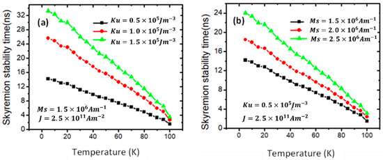 Similarly, the skyrmion stability time increased as Ms was increased, as shown in Figure 5b. For example, at a device temperature of 30 K, the stability time was 11 ns with, whereas it increased to 19 ns with . The increase in the skyrmion’s structural stability by increasing Ms is attributed to an increase in exchange energy [31].