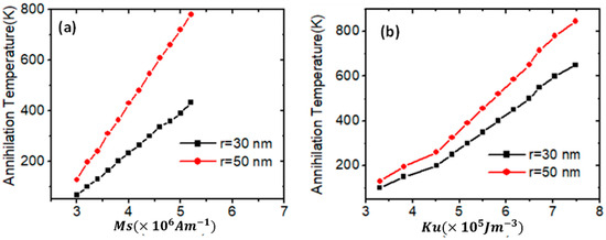 To enhance the structural stability time of the skyrmion at temperatures higher than room temperature, the skyrmion annihilation temperature was investigated by developing magnetic properties. Figure 6a shows the skyrmion annihilation temperature versus Ms for two values of skyrmion radii (r). For Ms values greater than 3.5 × 106 , the skyrmion was found to be more stable at room temperature and above. It was observed that for certain Ms values, skyrmions remain stable at temperatures up to 750 K with a skyrmion radius of 50 nm and up to 480 K with a radius of 30 nm, which is significant for storage applications. Similar results were found when increasing Ku; for Ku values greater than , skyrmions remained stable at device temperature up to 400 K and 800 K with r = 30 nm and 50 nm, as shown in Figure 6b.