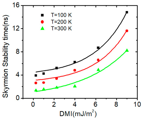 The effect of DMI interaction energy on the skyrmion’s thermal stability was investigated. It was found that the skyrmion structure becomes more stable against device temperature by increasing DMI energy. For example, at a device temperature of 100 K, the skyrmion stability time increased from 4 ns with a DMI value of 0.2 mJm−2 to around 14 ns with a DMI value of 9 mJm−2. Similar improvements in the skyrmions’ structural stability were observed at device temperatures of 200 K and 300 K, at which DMI values increased. Figure 7 shows the skyrmion stability time as a function of DMI for three different device temperatures.