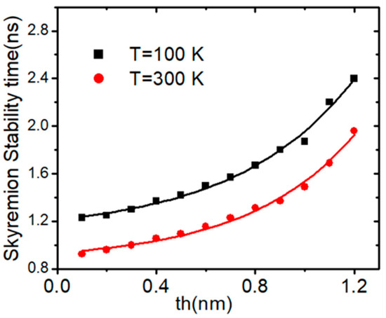The effect of device thickness (th) on skyrmion thermal stability was examined at two temperatures (100 K and 300 K). It was found that the skyrmion stability time exponentially increased for both temperatures, as shown in Figure 9a, which shows the dependence of skyrmion stability time () against device thickness (th) for the range temperatures of the device. This dependence can be described by an exponential relationship: