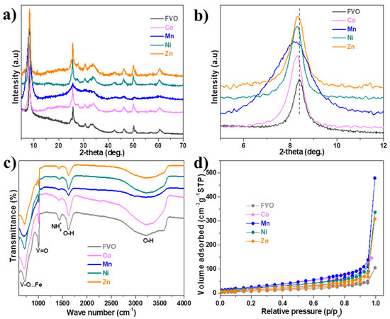 The powder XRD patterns of FeV2MO9.2.6H2O (M = Co, Mn, Ni, and Zn) samples are displayed in Figure 1a. All the samples’ diffraction peaks can be indexed to the single-phase FeV3O9.2.6H2O monoclinic structure, which has a space group C*/c-15 and lattice parameters a = 11.84 Å, b = 3.65 Å, and c = 21.27 Å, which are in agreement with the reported ICDC: 00-0-46-1334 [40,41]. All the doped samples show a modest shift in the diffraction peak at ~8.4° towards a lower angle (Figure 1b), indicating that the various transition metals have successful partially substituted V in the host lattice. This can be attributed to the larger ionic radii of the dopants (Co2+, Mn2+, Ni2+, and Zn2+) than V4+, as indicated in Table S1. As a result, the doped samples d-spacing increased, as shown in Table 2, which was determined using Bragg’s law of diffraction.