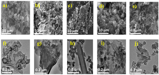 Figure 2 displays the samples’ FE-SEM and TEM images. The pristine FVO sample (Figure 2a,f) displayed a non-uniform plate-like morphology, whereas Co (Figure 2b,g), Ni (Figure 2d,i), and Zn (Figure 2e,j) samples showed a mixture of nanoparticles and nanosheets. However, the Mn-doped sample showed a mixture of nanoparticle and nanorod morphology. This unique morphology of the Mn sample is expected to improve electrochemical properties as it is expected to provide enhanced kinetic properties through 1D networks, as well as enhanced ionic diffusivity through direct contact between the electrolyte and particles [20,42].