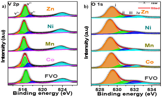 (a) V 2p spectra, and (b) O 1s spectra of all samples compared.