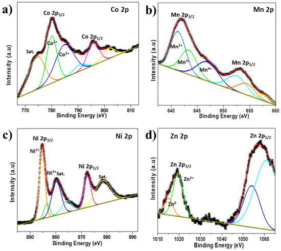 (a) Co 2p spectra of Co-doped FVO; (b) Mn 2p spectra of Mn-doped FVO; (c) Ni 2p spectra of Ni-doped FVO; and (d) Zn 2p spectra of Zn-doped FVO.