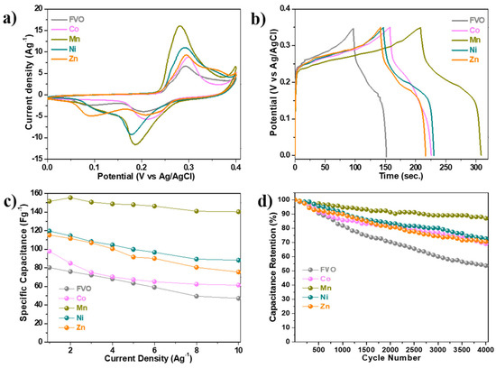 Using a three-electrode system in a 3 M KOH aqueous electrolyte, the effect of transition metal doping on the electrochemical properties of FeV3O9.2.6H2O was examined for supercapacitor application. The CV profiles of the electrodes at a scan rate of 20 mVs−1 and voltage window of 0.0–0.4 V are compared in Figure 5a, where all the samples showed identical anodic and cathodic peak shapes, indicating similar electrochemical reaction mechanism of characteristic pseudocapacitive behavior [19]. The metal-doped samples, however, have comparatively larger enclosed areas and peak currents. The Mn-doped sample exhibited the largest peak current, indicating that it has a higher capacitance than all other FVO samples. Figure S3a–e displays the CV profiles for pristine FVO and metal-doped (Co, Mn, Ni, and Zn) electrodes at different scan rates (10–50 mVs−1) and voltage windows 0–0.4 V. These profiles indicate strong reaction reversibility, which is demonstrated by well-maintained potential plateau shapes along with a characteristic peak shift with increasing scan rates.