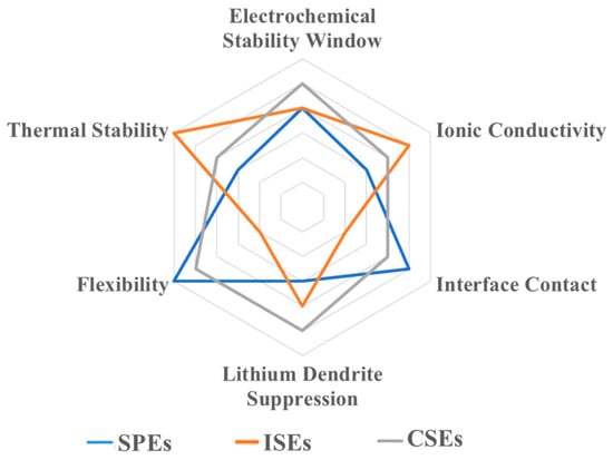 Solid-state electrolytes (SSEs) are the key components in solid-state batteries. It is important to obtain solid electrolyte materials with high ionic conductivity (≥10−3 S cm−1) and very low electronic conductivity (<10−10 S cm−1) [15], a wide electrochemical oxidation window, good chemical compatibility with the relevant electrodes, excellent thermal stability and mechanical properties [16], and that are easy to manufacture on a large scale and at a low cost. In the past few decades, three kinds of SSEs have been actively studied, including solid polymer electrolytes (SPEs), inorganic solid electrolytes (ISEs), and organic–inorganic composite solid electrolytes (CSEs). Great progress has been achieved in regard to synthesis and the ionic conductive mechanism. The properties of solid polymer electrolytes (SPEs), inorganic solid electrolytes (ISEs), and organic–inorganic composite solid electrolytes (CSEs) are shown in Figure 2.