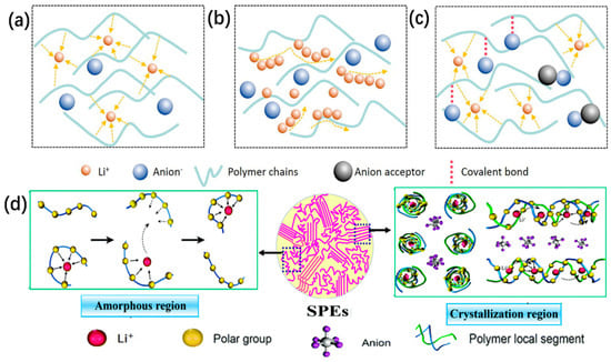 The transport mechanism of lithium ions in polymer electrolytes involves the lithium ions being conducted with the movement of the polymer chain segments. SPEs are mainly composed of a polymer matrix with a relatively small proportion of lithium salts (less than 50%), known as “salt-in-polymer” electrolytes (Figure 4a), which have low ionic conductivity [27,28,29,30]. Comparably, it was proposed that “polymer-in-salt” electrolytes have higher ionic conductivity, due to higher lithium salt content (over 50 wt.%) being employed in the polymer matrix (Figure 4b) [31]. Moreover, to prevent anions from migrating and to reduce the concentration polarization, single-ion (Figure 4c) conducting SPEs with a high ion transference number (tLi+) are designed in order to set anion traps or bind anions to the polymer matrix [9,20,32,33]. Meanwhile, the ion transfer rate of the polymer electrolyte is also influenced by amorphous and crystalline phases (Figure 4d). The migration of lithium ions is related to the free volume and transport properties of the polymer and the migration of macromolecular fragments during the solvation–dissolution process. Lithium ions will migrate from one coordination site to another or jump from one coordination site to another, along the direction of the polymer segment [34,35]. Specifically, lithium-ion transportation occurs primarily in the amorphous state, due to its lower glass transition temperature (Tg). Above the Tg, the chain segments begin to move, while the molecular chains do not. Thus, amorphous polymers in disordered environments allow local chain motion, which produces adjacent coordination sites, according to which ions can migrate [36,37]. In contrast, lithium ions in the crystallization section of the polymer electrolyte conduct Li+ through an ion jump, while the anions lie outside these channels and are separated from the cations by the interchain space [38,39]. For the migration of lithium ions in the amorphous and crystalline phases, there are differences and contradictions in different studies on the size of ionic conductivity in the crystal domain [40,41]. Most authors support the idea that a reduction in the Tg and an increase in the amorphous state of the polymer can improve the lithium-ion conductivity.