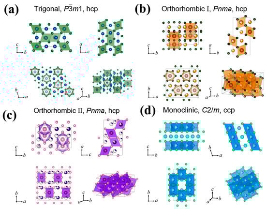 Crystal structures with a single unit cell (outlined) and the corresponding Li+ sublattice for: (a) a trigonal structure, (b) an orthogonal structure I, (c) an orthogonal structure II, and (d) a monoclinic structure [139]; copyright 2023, American Chemical Society.