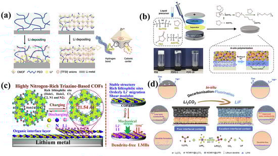 - Yue, L.; Wang, X.; Li, C.; Shen, D.; Shao, Z.; Wu, H.; xiao, s.; Liang, W.; Yu, Y.; Li, Y. In-situ interface engineering of highly nitrogen-rich triazine-based covalent organic frameworks for ultra-stable, dendrite-free lithium-metal anode. Energy Environ. Sci. 2024, 17, 1117–1131. [Google Scholar] [CrossRef]