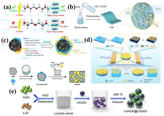 Lithium-ion batteries (LIBs) are integrated into our daily lives now and bring added convenience to travel and our daily lives [1]. It is important to improve the energy density, the duration, and the safety of batteries, to meet the demand for a new generation of batteries. As is well-known, traditional lithium-ion batteries involving graphite anode materials and liquid electrolytes have difficulty obtaining high-energy density, due to the theoretical limit related to the specific capacity (370 mAh/g) of graphite anodes [2,3], and present potential safety risks, due to the flammability and explosiveness of traditional organic liquid electrolytes (OLEs), and there is the potential for dendrite formation to puncture the separator, which may lead to short circuits at high currents [4,5]. In addition, OLEs are prone to oxidization and decomposition under a high voltage or high temperature, leading to the low cycling stability of batteries, which cannot meet the requirements of next-generation high-energy-density batteries. Solid-state lithium batteries with lithium metal as the anode materials and solid-state electrolytes (SSEs) as the ionic conductive medium can achieve high-energy density, due to the ultrahigh theoretical capacity (3860 mAh g−1) of lithium metal anodes and it having the lowest reduction potential of −3.04 V (vs. standard hydrogen electrodes) [6,7,8,9,10]. More importantly, SSEs have advantages over traditional liquid electrolytes, such as non-flammability, non-explosibility, and a wide electrochemical window, and they can inhibit the growth of lithium dendrites to improve the safety performance of lithium batteries [11,12], so they have been widely studied in recent years.
