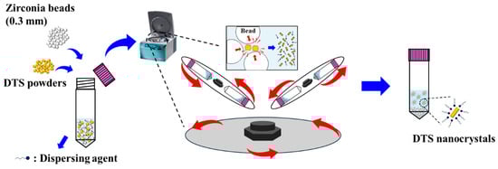 Illustration of DTS-NS manufacturing process using dual centrifugation-based bead-milling technique.