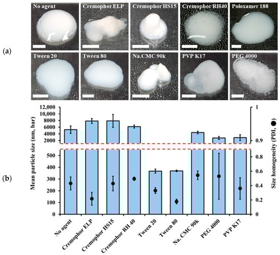 Influence of suspending agents on (a) the appearance and (b) particle size and homogeneity of DTS-NS formulas prepared using a lab-scale bead-milling technology. Notes: (a) All images were captured on glass slides within 10 min after fabrication (scale bar: 5 mm). (b) The concentrations of DTS and suspending agent were fixed at 40 mg/mL and 5 mg/mL, respectively. Bead milling was carried out at 1500 rpm for 1 h under conditions of −10 °C. Data represent means ± SD (n = 3).
