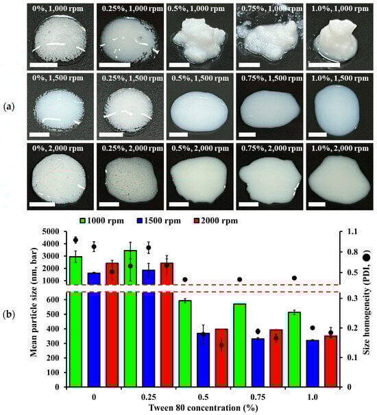 As shown in Figure 3a, NS prepared with a low quantity of Tween 80 (0 or 2.5 mg/mL) showed particle agglomeration, regardless of milling intensity. At a milling speed of 1000 rpm (milling time of 1 h), NSs with 0.5, 0.75, and 1.0% Tween 80 were uniformly dispersed within the initial 5 min but were aggregated and precipitated within 10 min. Conversely, well-dispersed uniform NSs were prepared at milling speeds of 1500 and 2000 rpm with Tween 80 concentrations of 0.5, 0.75, and 1.0%. This indicates that lowering the surface tension with a suspending agent, along with adequate pulverization energy, is necessary for wet bead milling to achieve a uniform, submicron-sized drug particle dispersion. The drug particle size and homogeneity of the DTS-NS were further assessed (Figure 3b). When the concentration of Tween 80 was set above 0.5%, the drug particle size tended to decrease drastically, and at a milling speed of 1000 rpm, the particle sizes obtained with Tween 80 concentrations of 0, 0.25, 0.5, 0.75, and 1.0% were determined to be 2940, 3440, 592, 570, and 513 nm, respectively. At milling speeds of 1500 rpm and 2000 rpm for 1 h, the particle sizes for Tween 80 concentrations of 0, 0.25, 0.5, 0.75, and 1.0% were 1612, 1853, 369, 332, and 320 nm, and 2418, 2425, 398, 393, and 351 nm, respectively. Irrespective of the milling speed, Tween 80 concentrations of 0.25% or lower resulted in particle sizes in the micrometer range. Conversely, when the Tween 80 concentration was 0.5% or higher, nanoparticles smaller than 1 µm were observed (Figure 3b). These results indicate that a minimum amount of surfactant is required to produce nanosuspensions, regardless of the milling speed. Nanosuspensions with particle sizes below 1000 nm have an exponentially larger surface area than microsuspensions [37]. Therefore, to stabilize the extensive surface area of nanosuspensions, an adequate amount of surfactant is required [38].